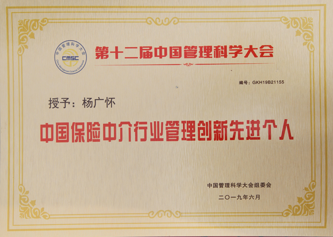 中国保险中介行业管理创新先进个人-证书